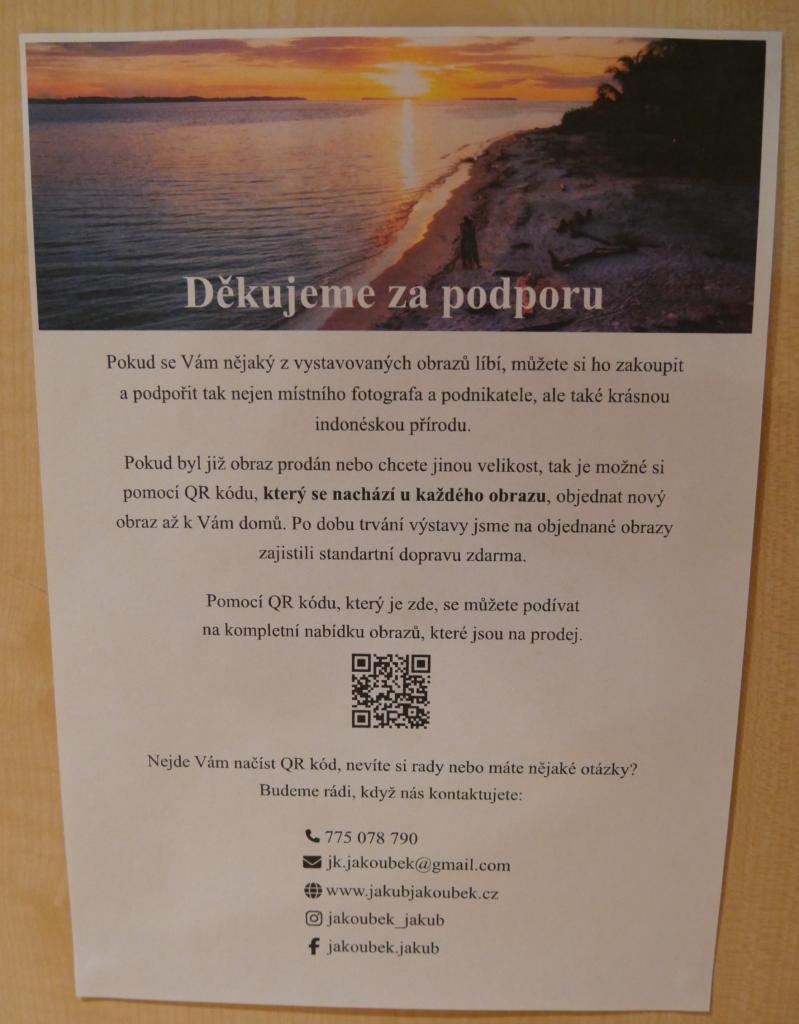 Na výstavě jsou k vidění velkoformátové fotografie tištěné na plátno, které je množné zakoupit. Část výtěžku z prodeje obrazů se manželé Jakoubkovi rozhodli darovat organizaci Justice for Nature, která se zabývá ochranou přírody mimo jiné i na indonéském ostrově Sumatra, který také navštívili.