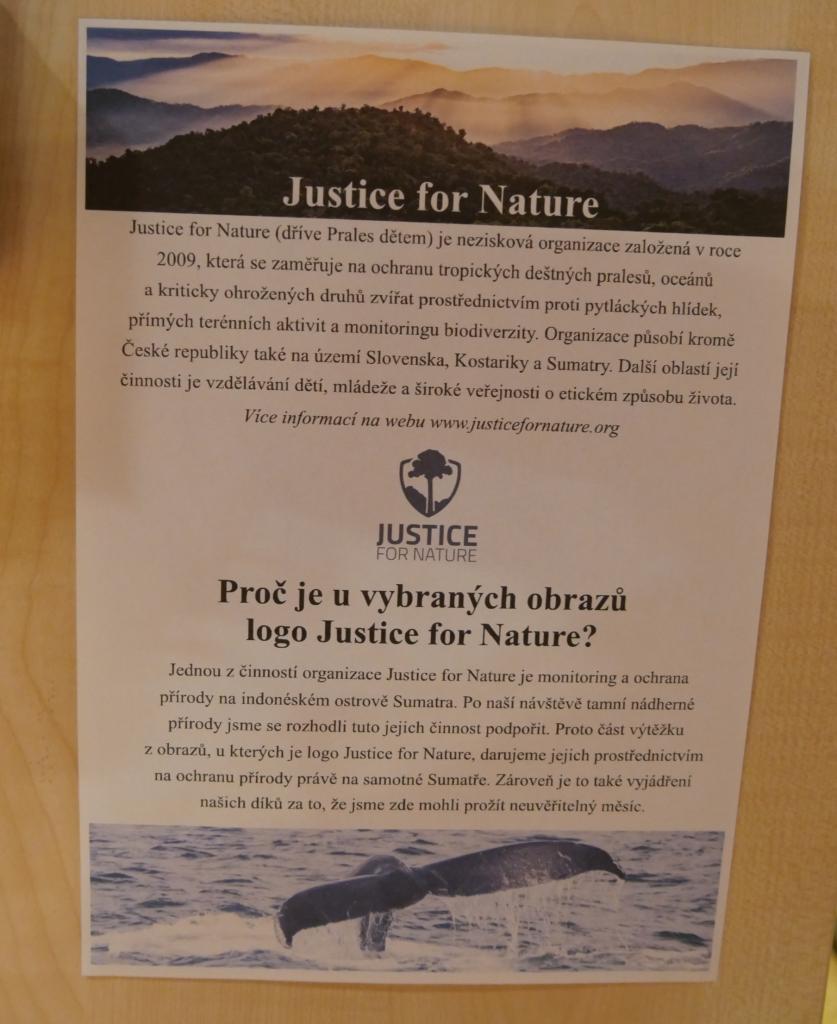Na výstavě jsou k vidění velkoformátové fotografie tištěné na plátno, které je množné zakoupit. Část výtěžku z prodeje obrazů se manželé Jakoubkovi rozhodli darovat organizaci Justice for Nature, která se zabývá ochranou přírody mimo jiné i na indonéském ostrově Sumatra, který také navštívili.
