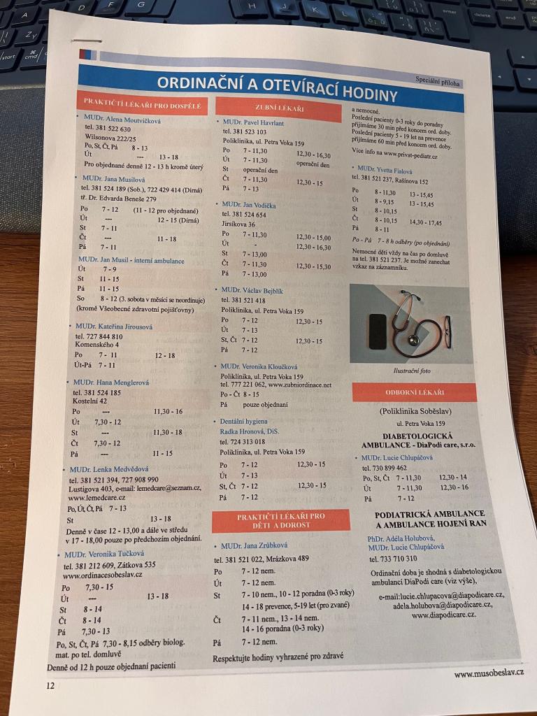 V únorové Soběslavské hlásce byly zveřejněny aktuální ordinační a otevírací hodiny lékařů a institucí v Soběslavi. Vzhledem k tomu, že je měsíčník už na řadě míst vyprodán, můžete si zdarma vyzvednout v infocentru tuto přílohu.