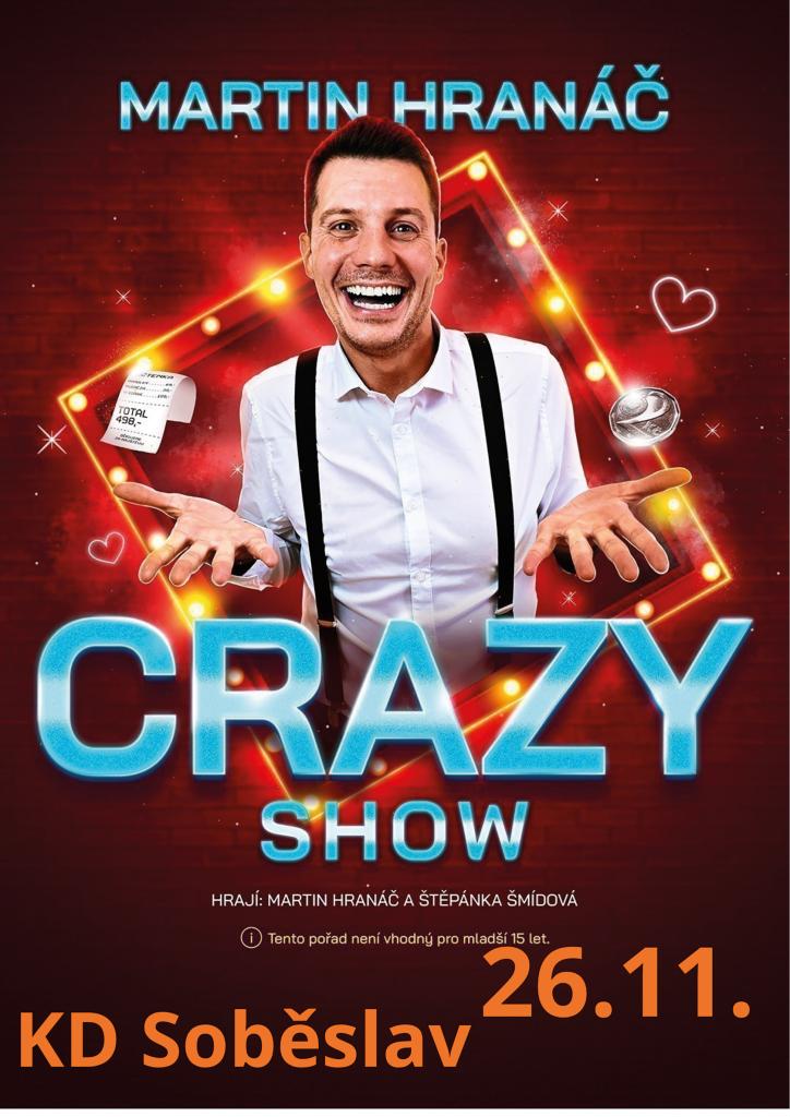 Chcete vstoupit do světa humoru a improvizace? Tak je CRAZY SHOW právě pro VÁS! Připravte se na nezapomenutelný večer plný smíchu s Martinem Hranáčem – komikem, hercem, číšníkem a optimistou, který svým jedinečným smyslem pro humor baví lidi na sociálních sítích. Martinův příběh číšníka a jeho každodenní zážitky z gastronomie se stávají zábavným vyprávěním, které osloví naprosto všechny. Každé vystoupení je unikátní a plné improvizace, protože Martin miluje improvizaci a scénáře mění v průběhu večera, což občas vykolejí jeho sestru Štěpánku Šmídovou, která mu dělá skvělou společnost během celé show. Všechny scénky a historky vychází z Martinových zkušeností a zážitků, jak profesního, tak soukromého života. Jeho humor je nekorektní, sebeironický a nebojí se jít na hranu – právě to dělá jeho show nezapomenutelnou! Nenechte si ujít tento jedinečný zážitek! Vstupenky na CRAZY SHOW právě v prodeji! Pořad není vhodný mladším 15 let!
