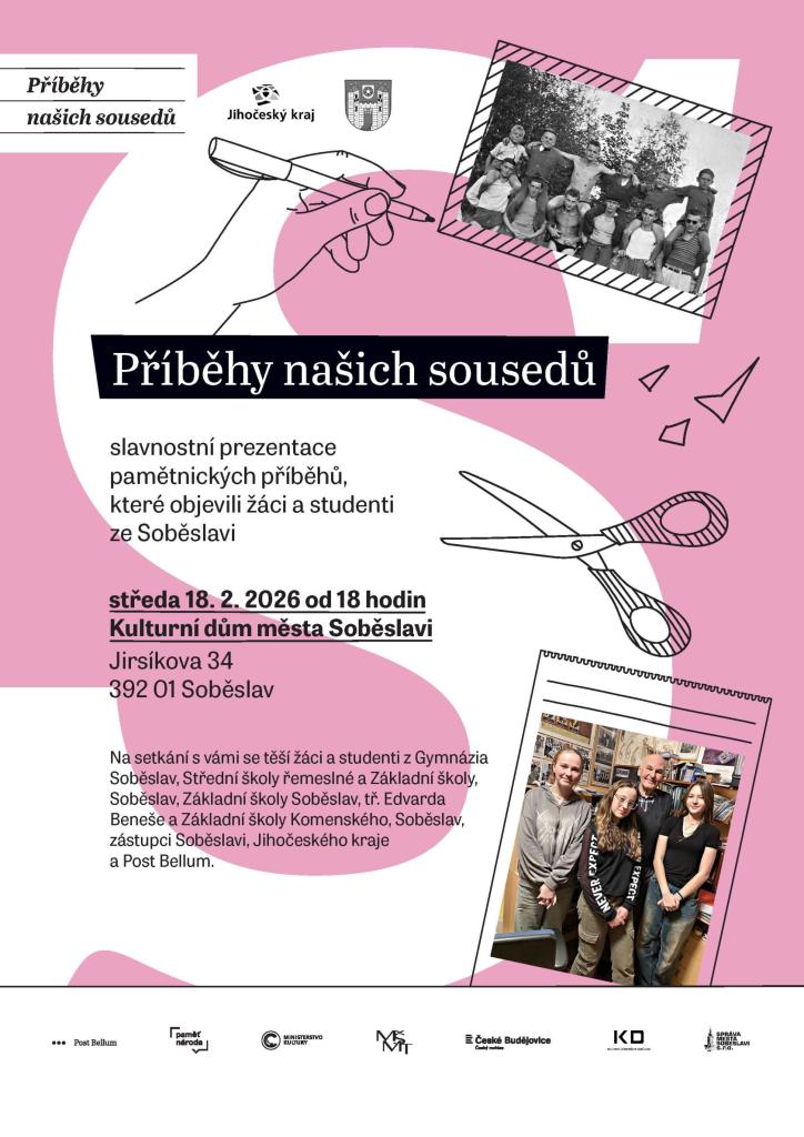 V letošním roce se Soběslav poprvé zapojila do projektu Příběhy našich sousedů neziskové organizace Post Bellum. Studenti a žáci Gymnázia Soběslav, Střední školy řemeslné a Základní školy, Soběslav, Základní školy Komenského, Soběslav a Základní školy Soběslav, tř. Dr. E. Beneše s pomocí svých učitelů sestavili týmy a našli zajímavé pamětníky, jejichž vyprávění natočili na diktafon či na kameru. Z jejich celoživotních vzpomínek pak mladí dokumentaristé zpracují reportáže, které představí pamětníkům, svým spolužákům, rodičům, učitelům a veřejnosti na závěrečné prezentaci, která se bude konat 18. února 2026 od 18 hodin v Kulturním domě města Soběslavi.
