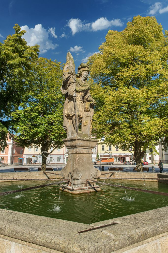 Střed náměstí zdobí starodávná kamenná kašna se sochou sv. Floriana, patrona města. Poblíž kašny, s pohledem na Smrčkův dům, stojí Mariánský sloup s korintskou hlavicí a pozlacenou kamennou sochou Panny Marie. Pochází z roku 1713.