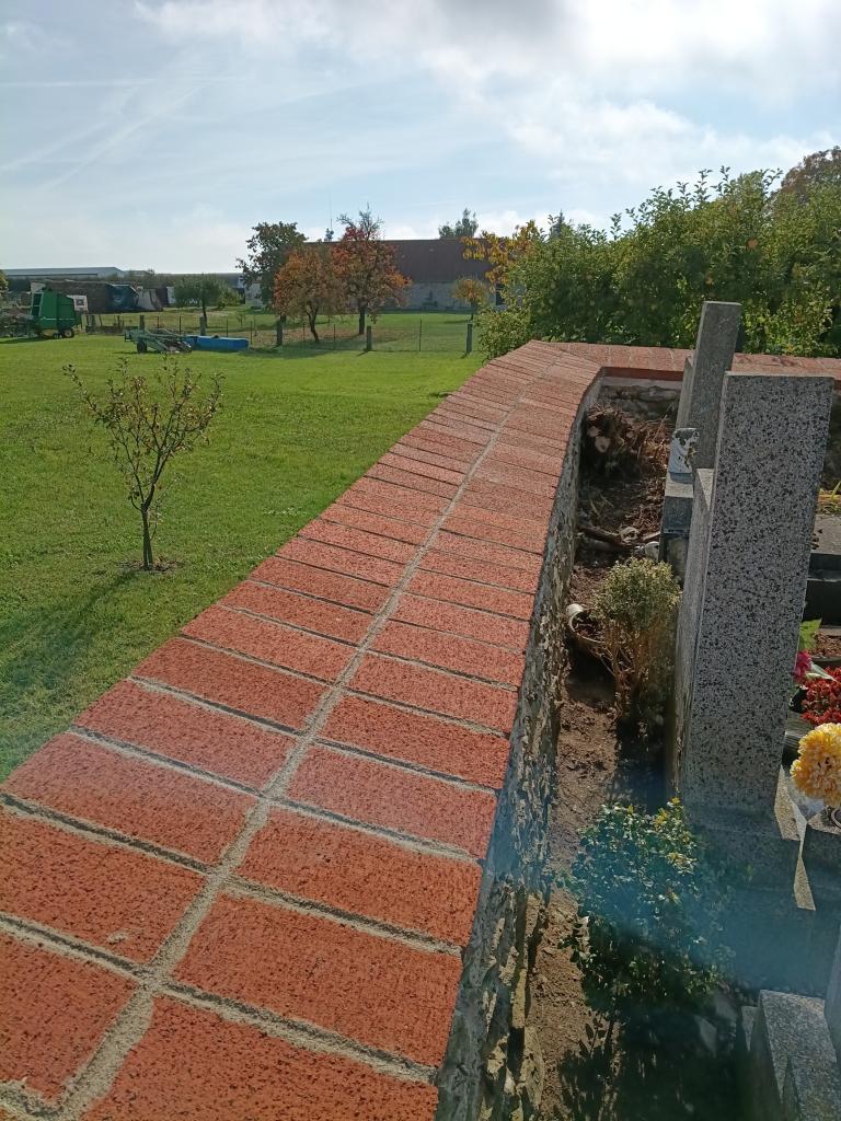 Předmětem obnovy byla oprava koruny hřbitovní zdi. Nejdříve došlo k odstranění stávajícího betonu a tašek. Narušené kamenné zdivo bylo doplněno novými kamennými prvky do maltového lože. Došlo k osazení koruny klasickými tvrdými ostře pálenými lisovanými cihlami (šancovky), mrazuvzdornými a odolnými vlhkosti. Cihly byly vyspárovány mrazuvzdornou spárovací maltou.
