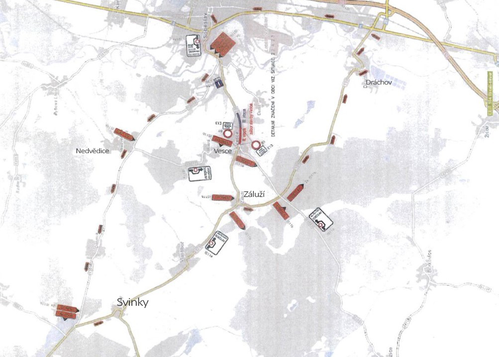 Silnice přes Vesce nebude na obce Záluží, Vlastiboř, Svinky či Mokrá průjezdná. Na okolní obce se řidiči ze Soběslavi dostanou po objízdných trasách, které vedou přes Nedvědice a Dráchov. Pro auta s hmotností nad 6 tun pak přes Veselí nad Lužnicí nebo Planou nad Lužnicí.