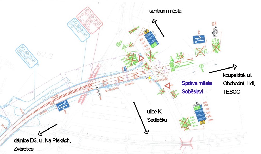 Nové dopravní řešení křižovatky u Správy města Soběslavi je znázorněno níže: