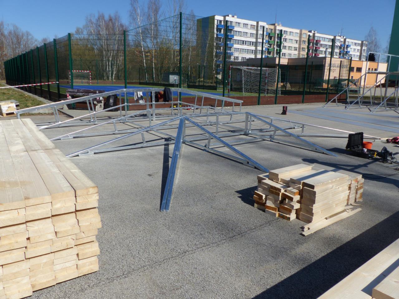 Pracovníci spol. JF Construction, s.r.o., v současnosti pokrývají konstrukce fošnami, na které na závěr přijde pojezdový povrch.