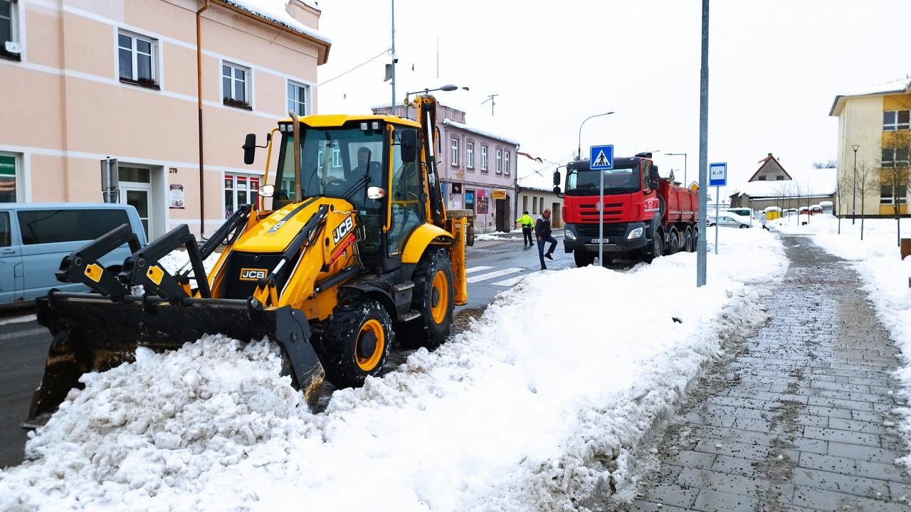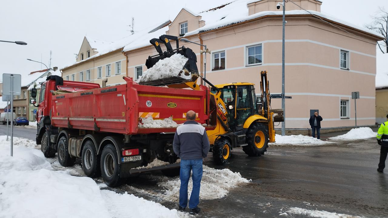 V současnosti probíhá odklízení a odvoz sněhu v ulici tř. Dr. E. Beneše. Dopravu řídí městská policie.